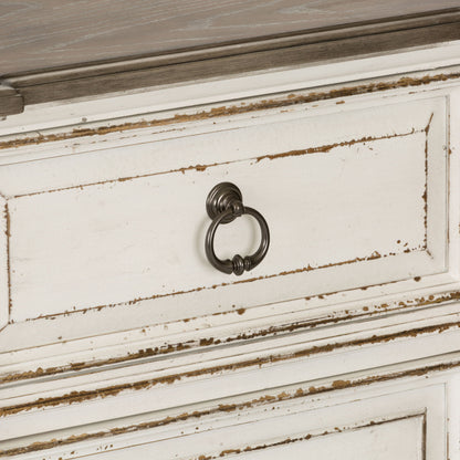 This 2 drawer night stand is the perfect way to accent your room with an effortless blend of European Traditional design. Weathered brown whitewash top and antique white finish, combined with heavy chipping, creates a truly unique look. Enjoy the convenience of having a built-in charging station in the back of the night stand, featuring two USB ports and two outlets. The post design with fluted top accents and chamfered edges completes this traditional piece.
