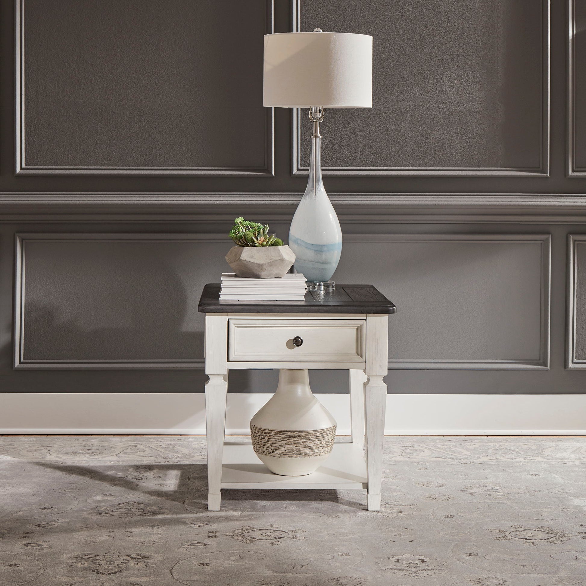 Enhance your space with the Allyson Park drawer end table. Crafted of pine solids and veneers with cathedral white oak tops, this piece features a wire brushed white finish with a planked charcoal top, one wood framed full extension drawer accented with antique pewter knob hardware, a bottom shelf for additional storage, and is anchored by square tapered legs. This classic end table would make a gorgeous addition to your casual styled home.