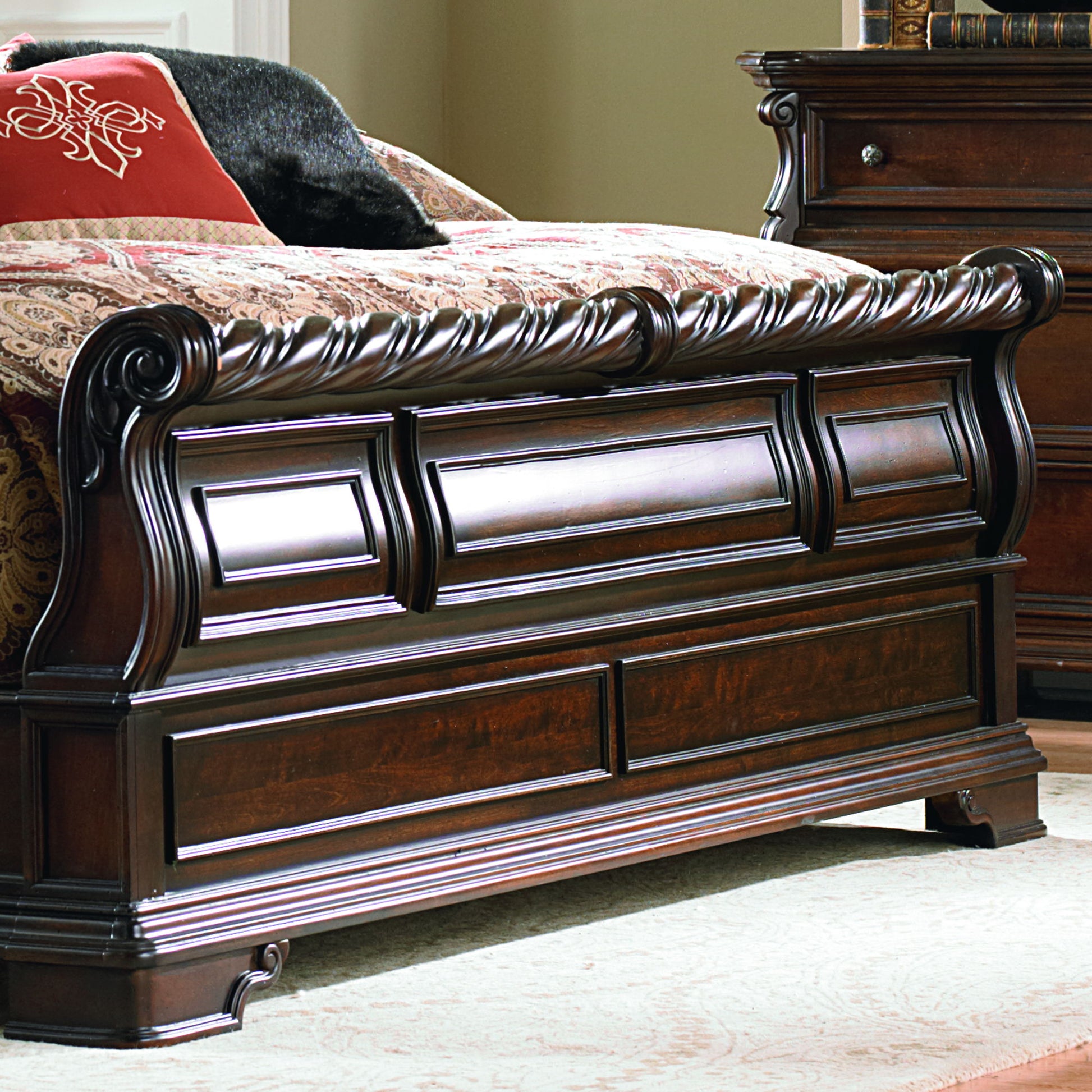 Features sleigh style with rope twist cap rail, accent bead molding, carved side post and bracket feet. Cannot stand alone. Pair with the headboard and rails for a complete bed.