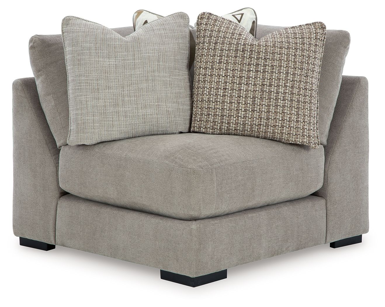This wedge is made with polyester upholstery. Fully finished on all sides, it pairs with other items in the series to make a modular sectional.