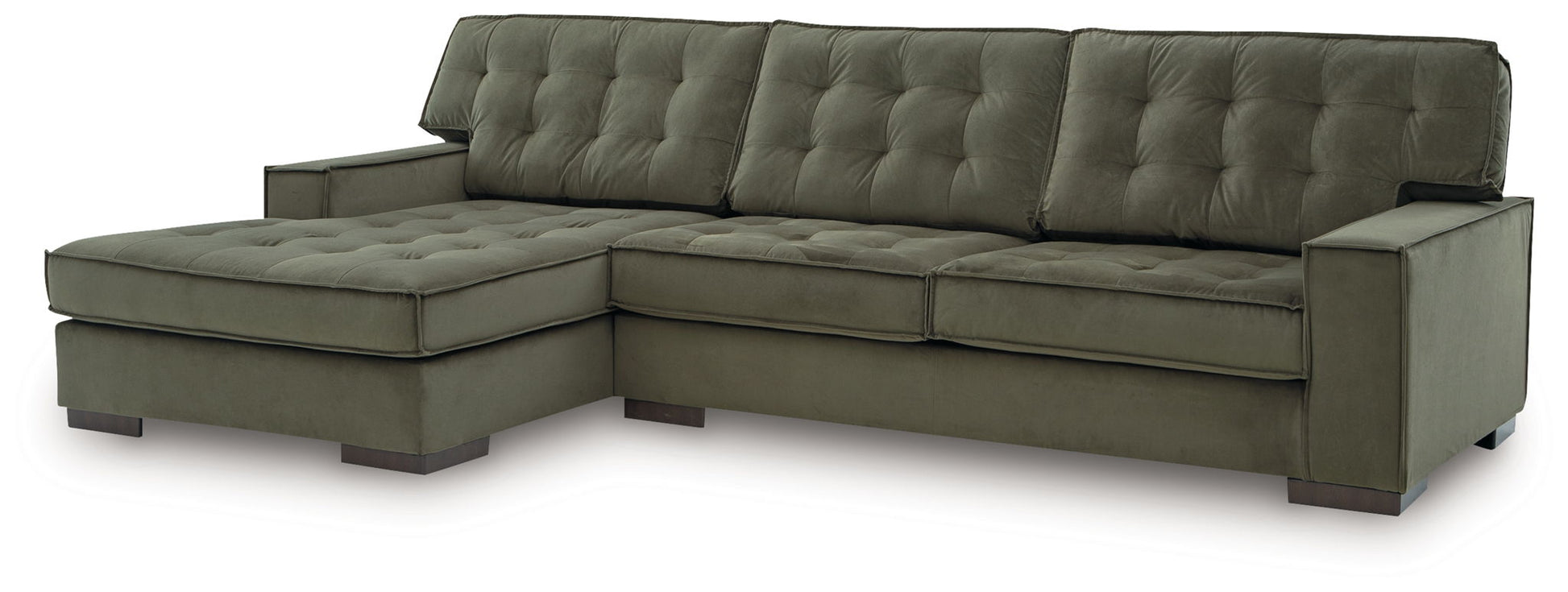 This sleek sectional with chaise offers a highly contemporary look with plenty of space to spread out. Dramatic tufted detailing and luxurious upholstery in a rich olive color create a sophisticated atmosphere. The sectional is perfect for those who love to entertain, or simply relax, in uptown style and comfort.