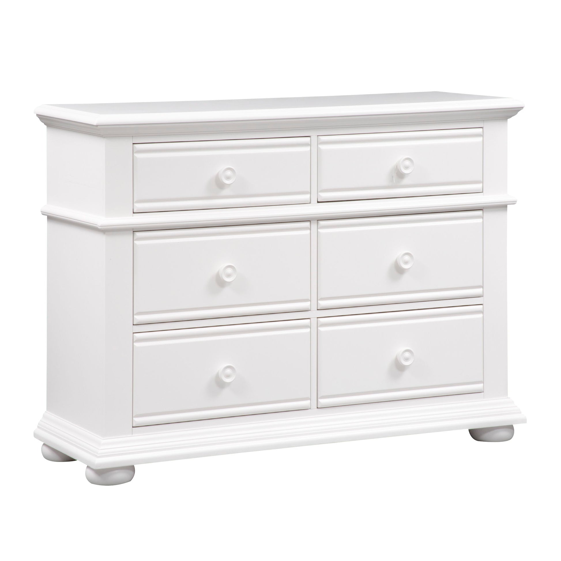 Obtain a fashionable cottage look with the Summer House 6 drawer dresser. Crafted of pine solids with painted MDF, this piece features bottom case dust proofing, full extension drawer glides for easy access to storage, fully stained interior drawers, felt lined top drawers, and is accented by wooden knob hardware.